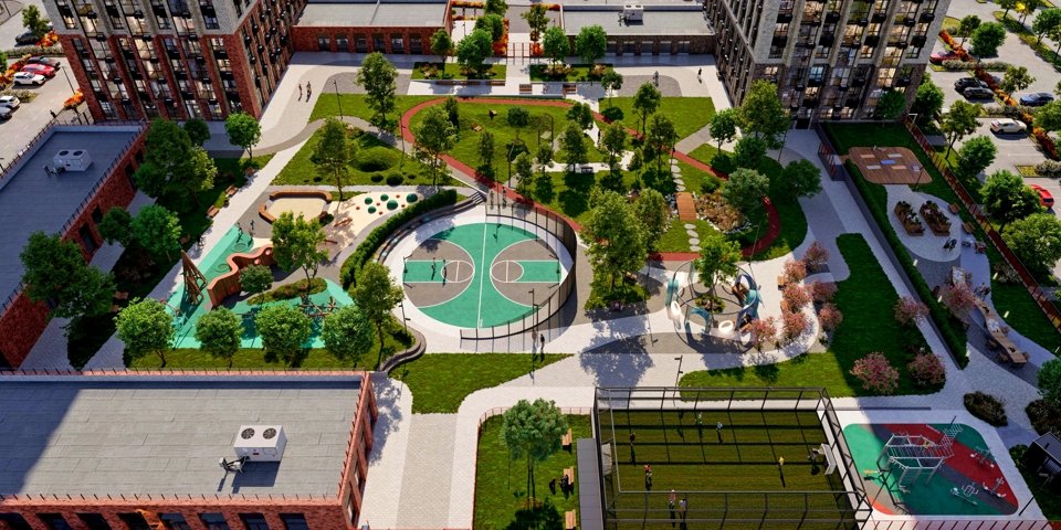 Закрытые дворы без машин, Просторные зоны для прогулок и отдыха, которые позволяют жильцам наслаждаться тишиной и безопасностью. Комплекс окружен зелеными аллеями, зонами с декоративными растениями и арт-объектами, создающими гармоничное пространство для прогулок и встреч. На территории комплекса расположены современные игровые площадки для детей всех возрастов, а также оборудованные спортивные зоны для активного отдыха.