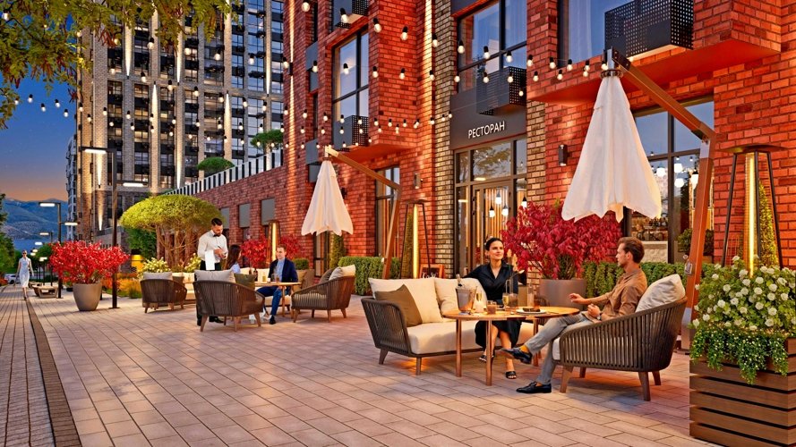 Любителям спокойного отдыха будет не менее комфортно. Трехуровневый ландшафтный дизайн прилегающей территории, прогулочный бульвар с фонтаном, зоны отдыха с распылителями холодного тумана, зона скалодрома и роллердрома успешно дополняют общую картину.