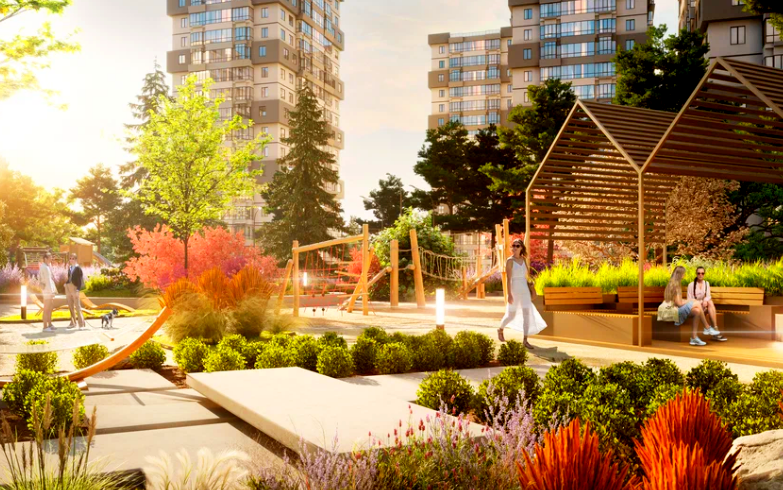 Территория жилого комплекса «Золотой Берег» продумана до мелочей: уютные прогулочные зоны и ухоженные пространства идеально подходят для спокойного отдыха